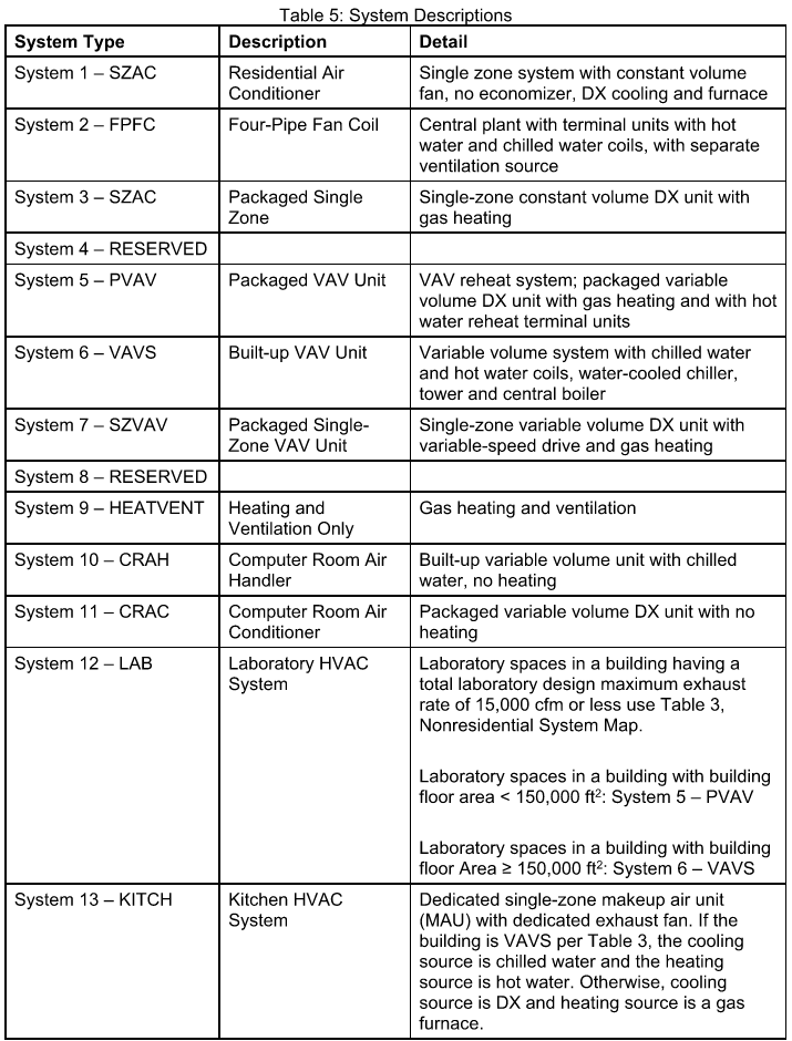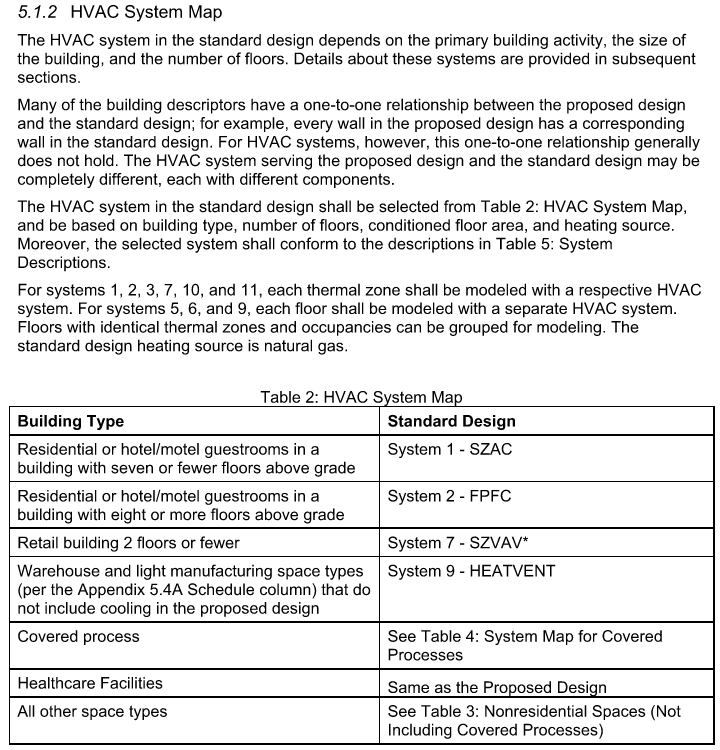 Airside HVAC system types are specified according to the HVAC System Map in the ACM Reference Manual (Table 2, below). The HVAC System map prescribes standard design system types based on the building type, building area, and number of floors. Other components of the building can also influence the HVAC type and/or required controls, including cooling capacity (e.g. economizers), occupant density (e.g. demand-controlled ventilation), and space type (e.g. kitchen, data centers, and labs). Equipment performance represents minimal compliance with the prescriptive requirements for each code vintage.